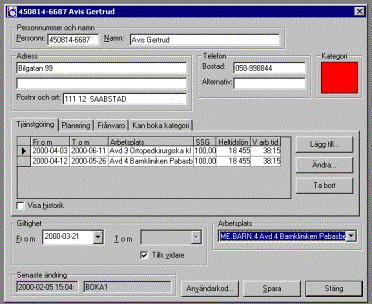 "Personkortet" i Timetool Boka. Vid drift som är integrerad med PA-/lönesystem hämtas de flesta uppgifterna automatiskt därifrån.